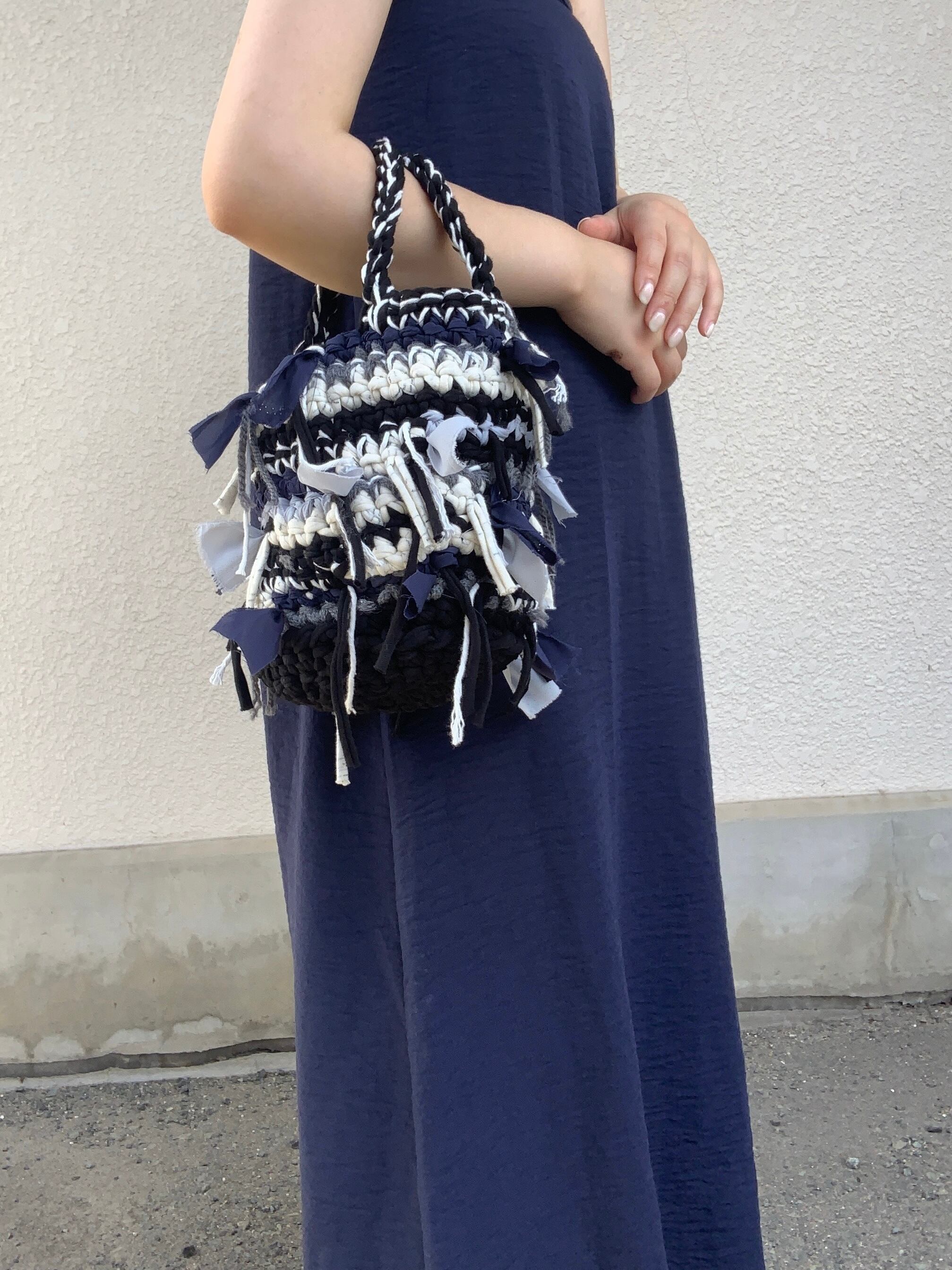 アパレルの廃棄素材から鞄を製作する中で残ってしまう残布で作っておりますその為、製品のつなぎ目、太さや色、毛羽立ち、素材感などトレンドを活かしたデザインを60歳以上のメンバーで心を込めて作製しております。