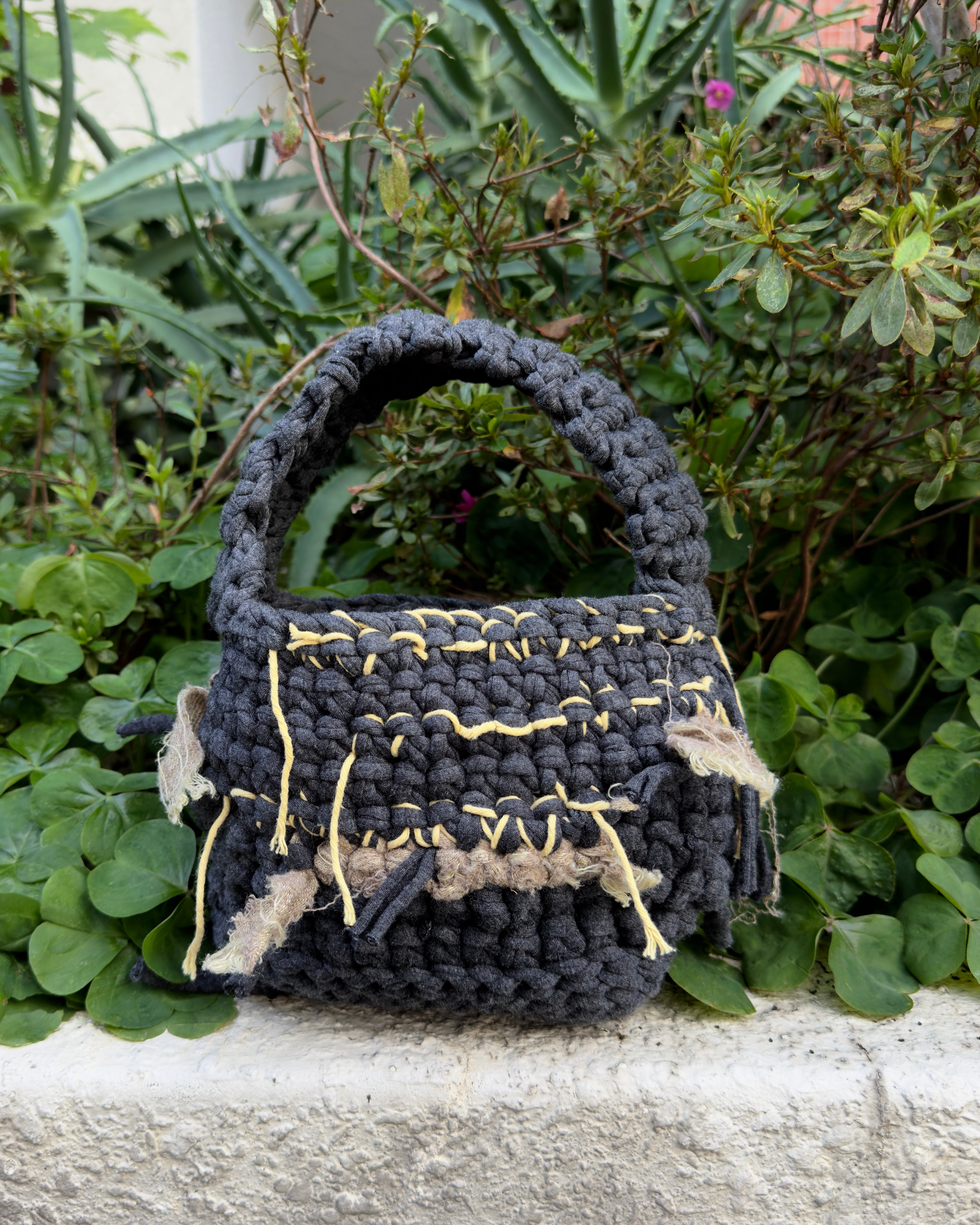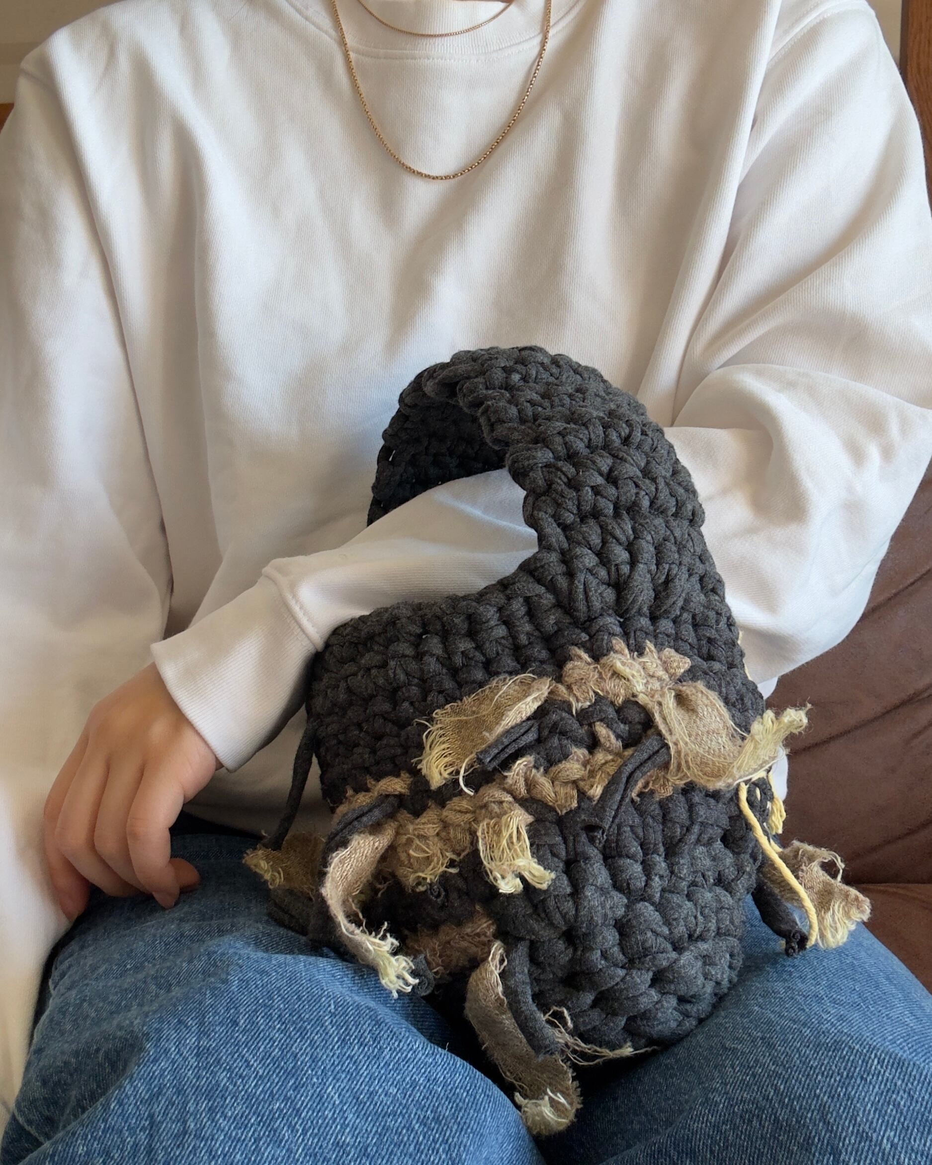アパレルの廃棄素材から鞄を製作する中で残ってしまう残布で作っておりますその為、製品のつなぎ目、太さや色、毛羽立ち、素材感などトレンドを活かしたデザインを60歳以上のメンバーで心を込めて作製しております。