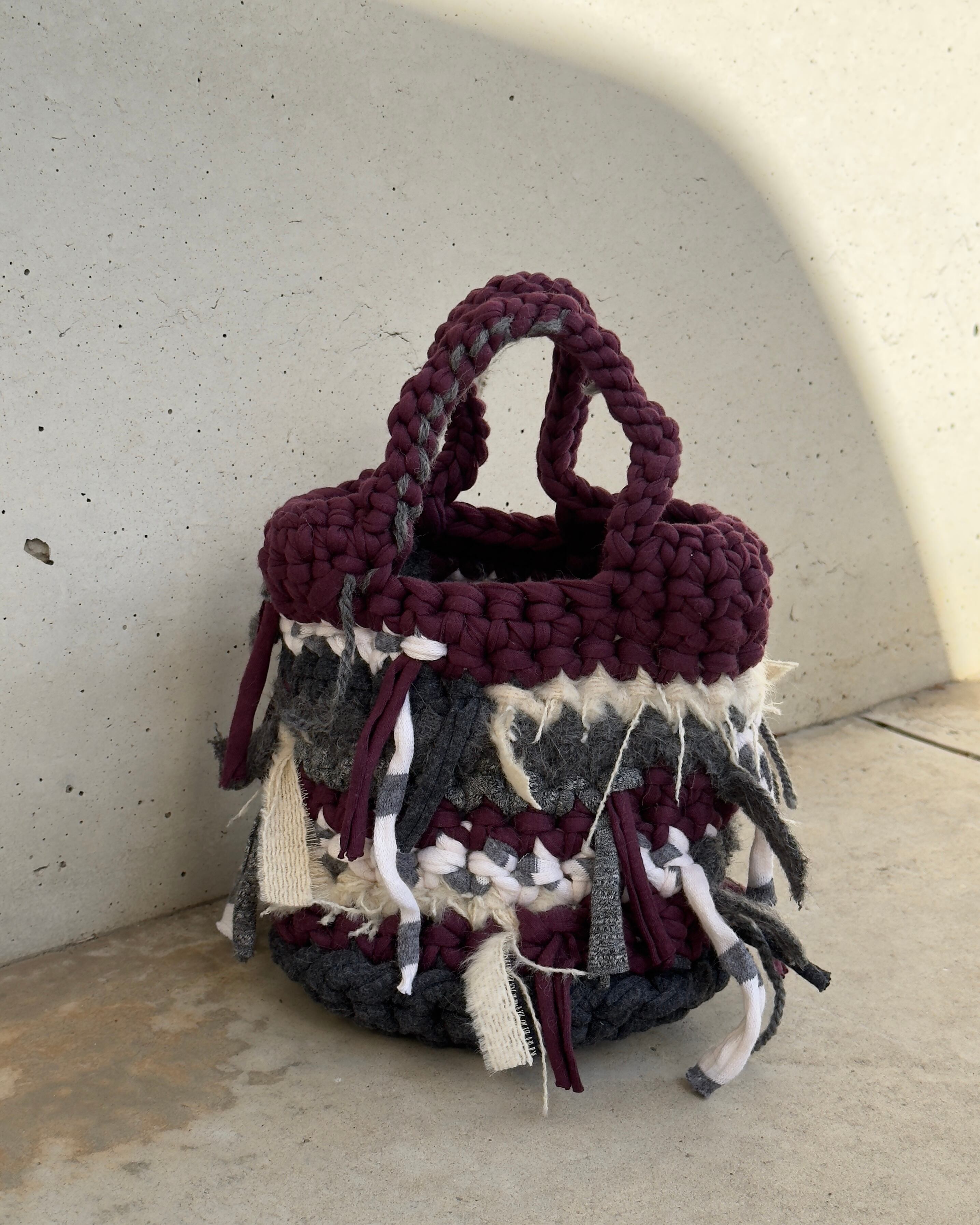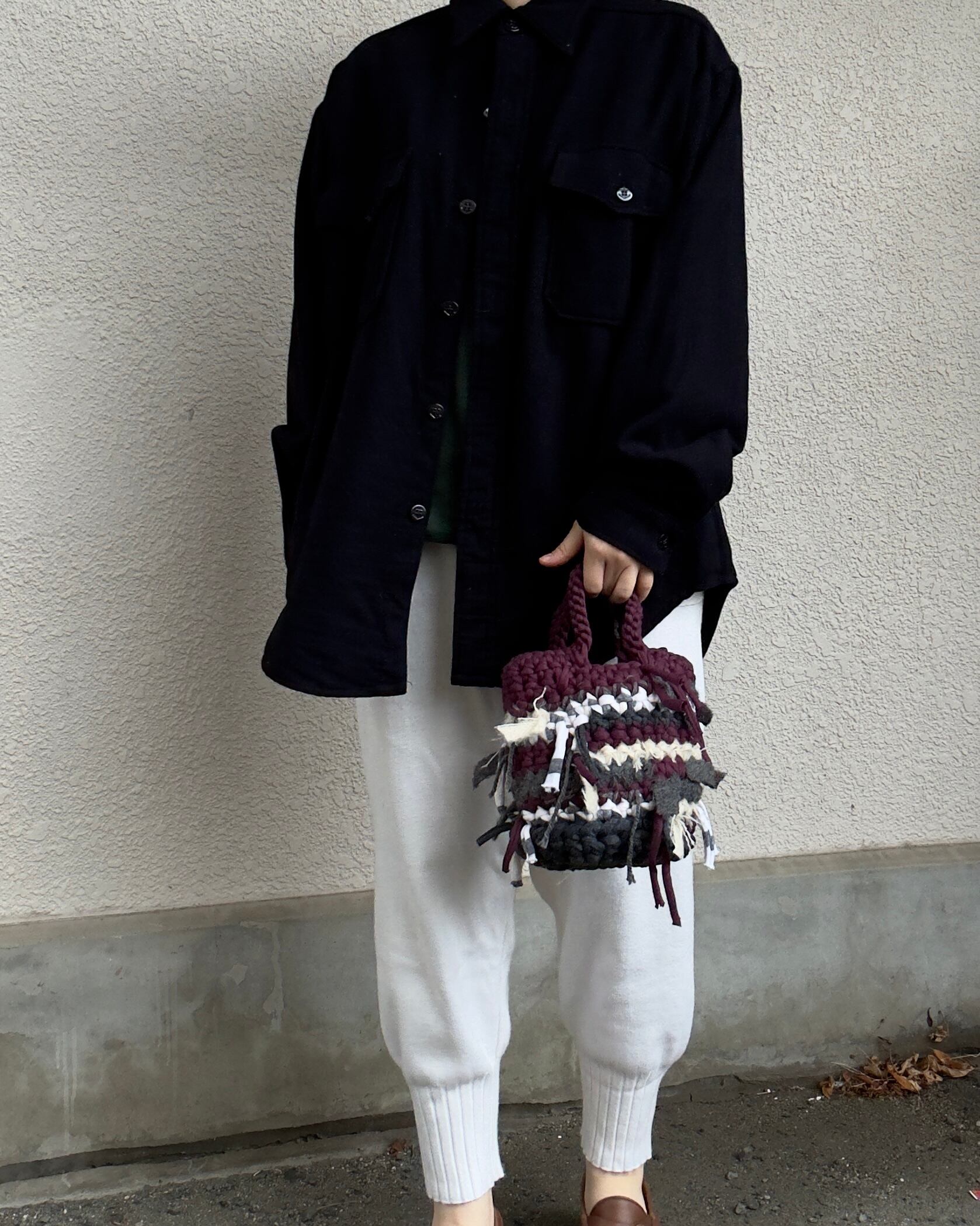 アパレルの廃棄素材から鞄を製作する中で残ってしまう残布で作っておりますその為、製品のつなぎ目、太さや色、毛羽立ち、素材感などトレンドを活かしたデザインを60歳以上のメンバーで心を込めて作製しております。